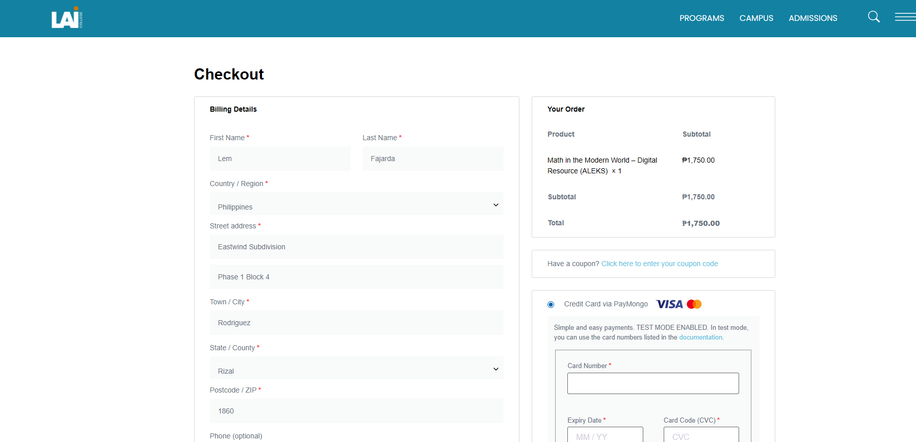4. On the checkout page, fill in your billing details and select your preferred test payment option.